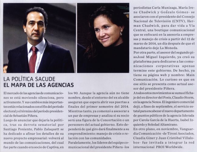 En otro plano, en noviembre, Vanguardia Comunicación -de Tironi Asociados, Claudia Giner y Juan Cristóbal Villalobos- fue invitada a integrar la red internacional PROI Worldwide.